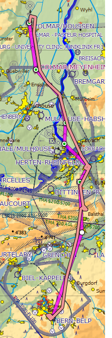 We filed a flight plan for a flight to Colmar, about 70 miles north in France. Clear of airspace Delta at Bern I called Basel Information. I established two-way communication followed by my position and intention. ATC seemed to have a bad day. As you can see on the flight log I had to do orbits at two points. Coordination between Information and tower seemed to be slow. It was a bit odd because the airport didn’t look that busy.