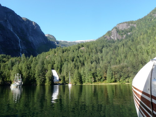 The second flight today was to the west again. Chatterbox Falls was one of the nicest places I’ve ever seen. I flew along a fjord and then turned into a tight valley. Since it was impossible turn in there due to terrain and trees on both sides and a mountain ahead, we had to land straight in and nail it on first attempt. You get in one way and you get out the other way! There was no wind and the water was glassy which meant to be extra careful; without waves you can’t judge your height. This approach was exciting. π Gotta show you some pictures!