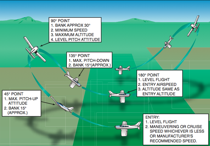 First, a 30° bank is established at full power and pitch is increased until half of the one-eighty is completed. During the second part, the aircraft is smoothly rolled out of the turn, while the pitch attitude remains the same. The angle of attack is increasing (the nose must remain at the same pitch, or height above the horizon) until the airplane is rolled level at the end of the turn and the airplane is within 5kts of stalling speed.